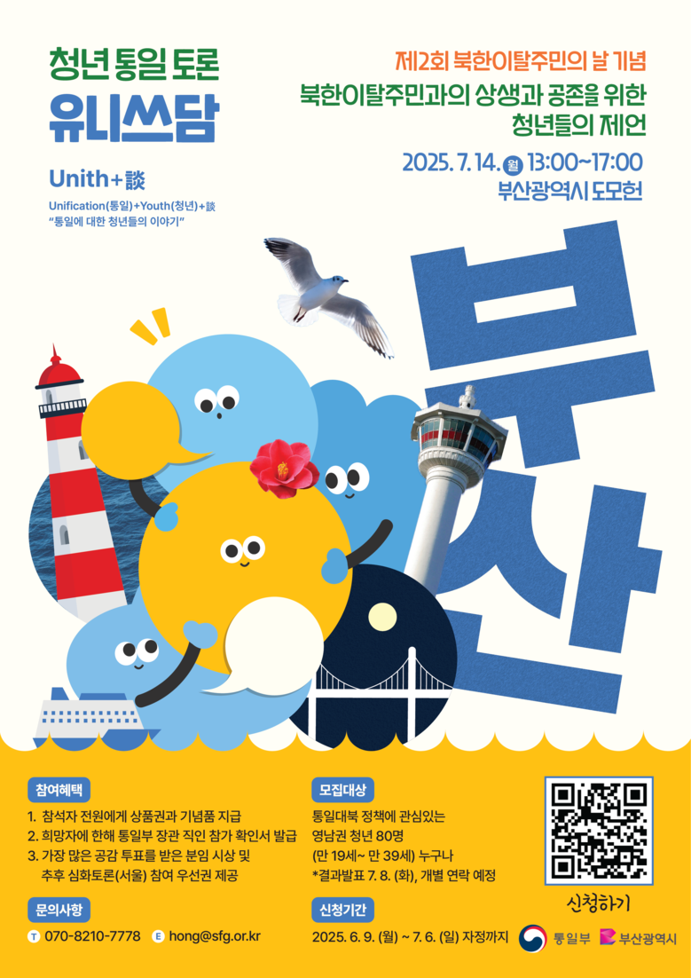토론회에는 사전 참가 신청을 통해 선정된 영남권 청년 80명과 부산에 거주하는 북한이탈주민이 분임 토론 등에 참여할 예정이다.