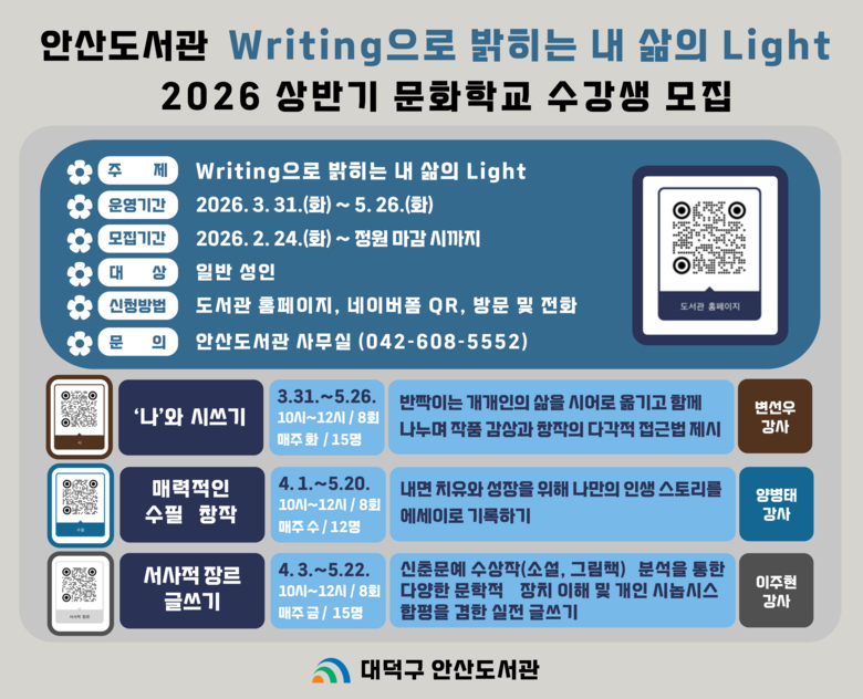 안산도서관은 ‘Writing으로 밝히는 내 삶의 Light’를 주제로 2026년 상반기 문화학교 수강생을 오는 24일부터 모집한다고 밝혔다.