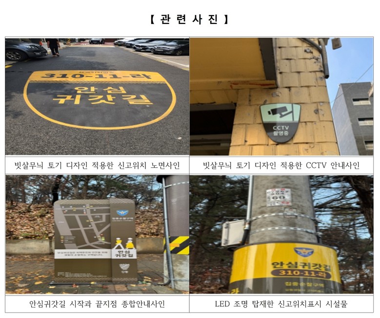 안심귀갓길의 시작과 끝 지점에는 종합안내사인을 설치해 이용 정보를 제공하고, 야간에 식별이 어려웠던 기존 신고위치번호와 비상벨에는 LED 조명을 설치해 가시성을 높였다. 또한, ▲CCTV 안내사인 ▲후미진 건물 사이 방범펜스 ▲공동현관 미러시트 ▲필로티 주차장 반사시트 등을 설치해 사전 범죄 예방 효과를 높였다.