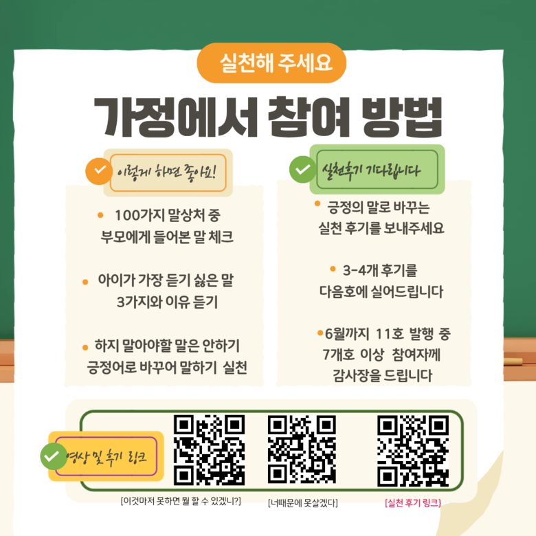 허그(HUG)레터는 월별 주제에 따라 영상 자료, 말 연습 실천 과제, 가정에서 바로 적용 가능한 대화 예시, 학부모 실천 후기로 구성되어 있다. 특히 학부모가 직접 실천 경험을 기록하고 공유하는 참여형 설문과 후기 작성을 통해, 가정 내 변화를 스스로 발견하고 확산하는 구조로 설계되었다.