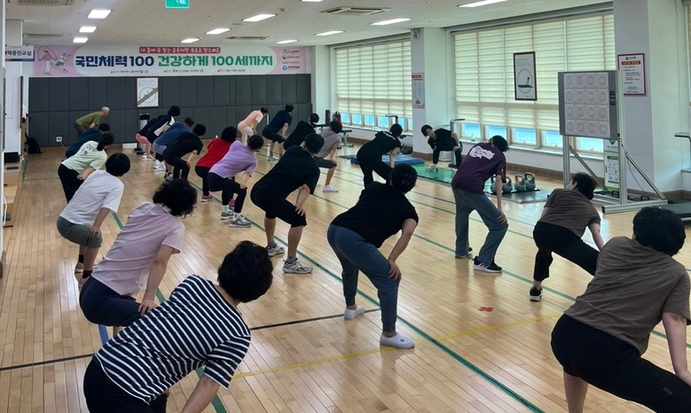 | ▲ 2025년 2기 체력증진교실 참여자들이 스트레칭을 하고 있다 |