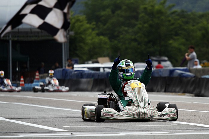 [사진설명] 이창욱이 9일 파주 스피드파크에서 열린 2019 카트 챔피언십 3라운드 선수부 결승 레이스에서 1위로 경기를 마무리하며 환호하고 있다.