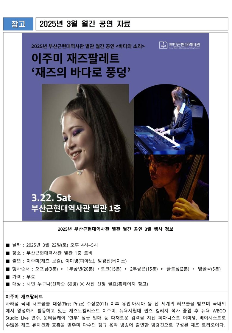 ◈ 3.22. 16:00 별관에서 자라섬 국제 재즈 콩쿠르 대상 수상 재즈 보컬리스트 이주미 씨 무대 선보여 [부산 세계타임즈=이용우 기자] 부산근현대역사관(이하 역사관)은 오는 3월 22일 오후 4시 복합문화공간 별관에서 월간 공연 '바다의 소리'를 개최한다고 밝혔다.