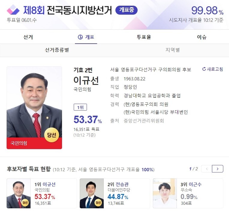 [세계타임즈 백진욱 기자] 국민의 힘 이규선 후보가 제 8회 전국동시지방선거 서울 영등포구다선거구에서 구의회의원으로 당선됐다.