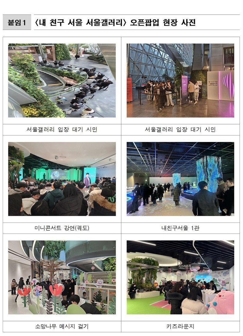 - 시 “서울의 비전을 공유하는 복합문화공간으로 ‘서울갤러리’가 자리매김할 것이라 기대 ” [서울 세계타임즈=이장성 기자] 시청 지하공간에 새롭게 문을 연 복합문화공간 ‘내 친구 서울 서울갤러리’(이하 ‘서울갤러리’)가 2월 5일(목)부터 7일(토) 3일간 개관 기념행사를 성황리에 마치며 시민·관광객의 뜨거운 호응 속에 서울시를 대표하는 새로운 인기 명소로 첫발을 내디뎠다.