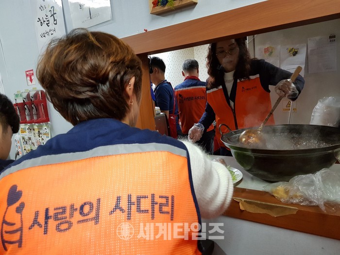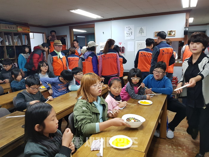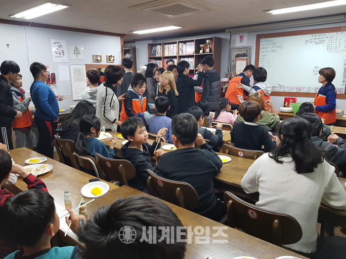 [대전=세계타임즈 이장성 기자] SNS에서 자발적으로 만들어진 5천명 봉사단체 사랑의 사다리 밴드(리더 이정제)가10월 31일 오후 4시∼7시 유성구 진잠에 위치한 하늘꿈 지역아동센터(원장 전대진) 45명의 아이들에게 즉석에서 짜장면을 만들어서 훈훈한 이웃사랑을 전했다.