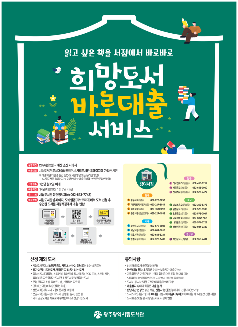 송경희 시립도서관장은 “희망도서 바로대출 서비스는 시민들에게 독서 편의를 제공할 뿐만 아니라 지역 서점과의 상생을 통해 지역경제 활성화에도 기여하고 있다”며 “앞으로도 일상 속 독서문화 확산을 위해 시민이 체감할 수 있는 사업들을 꾸준히 발굴·운영하겠다”고 말했다.