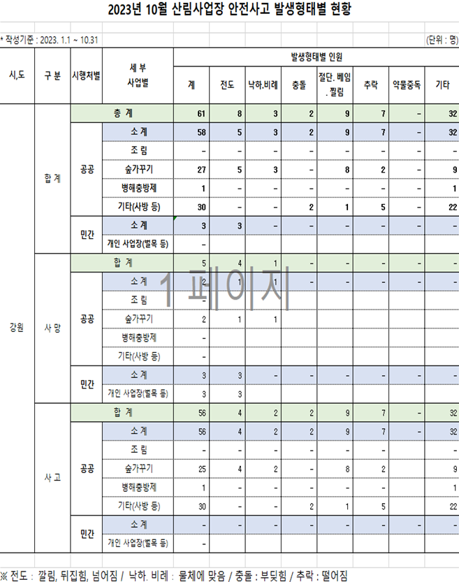 - 산림사업장 안전수칙 준수 등 철저한 안전관리 당부 [강원도 세계타임즈=김민석 기자] 도내 산림사업장에서 올해 10월 말 기준으로 5건의 사망사고가 발생하는 등 한해 평균 200건의 안전사고가 발생해, 산림사고 안전불감증이 여전하다는 지적이다.