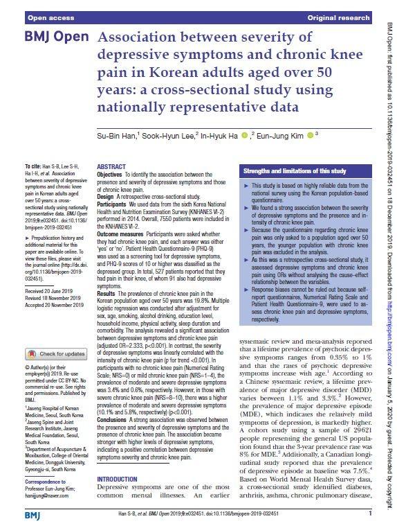 | ▲‘BMJ Open’ 2019년 12월호에 게재된 해당 연구 논문 「Association between severity of depressive symptoms and chronic knee pain in Korean adults aged over 50 years: a cross-sectional study using nationally representative data」 |
