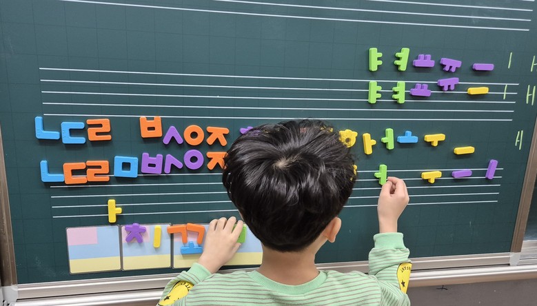 | ▲ 지난해 성진초등학교에서 문해력 향상 지도 모습(엘코닌 상자를 이용한 한글 자모음 위치 지도 및 자음모음 소리 찾기)/광주시교육청 제공 |
