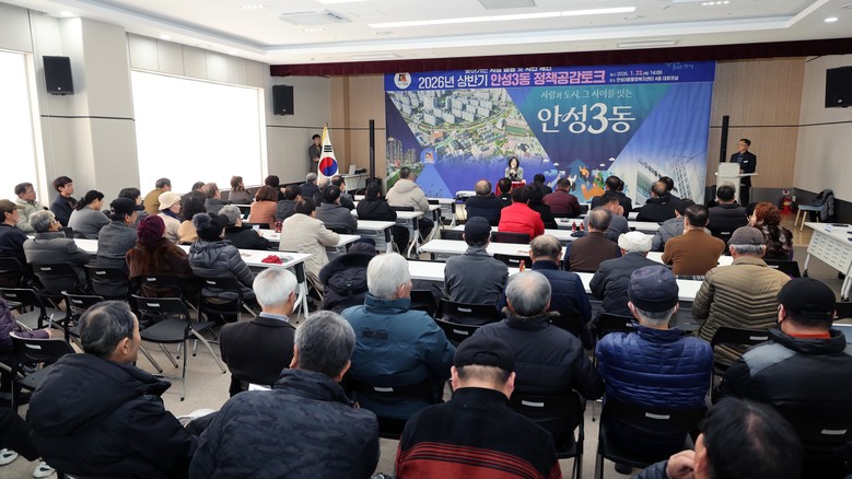 이번 정책공감토크는 2026년 안성시의 시정 운영 방향을 공유하고, 안성3동의 현안과 발전 방향을 주민들과 함께 만들어가기 위해 마련되었으며, 안성3동 주민자치센터 민요반의 식전 공연을 시작으로 시정 브리핑, 안성3동 현안 발표, 2025년 하반기 건의 사항 검토 결과 순으로 진행됐다.
