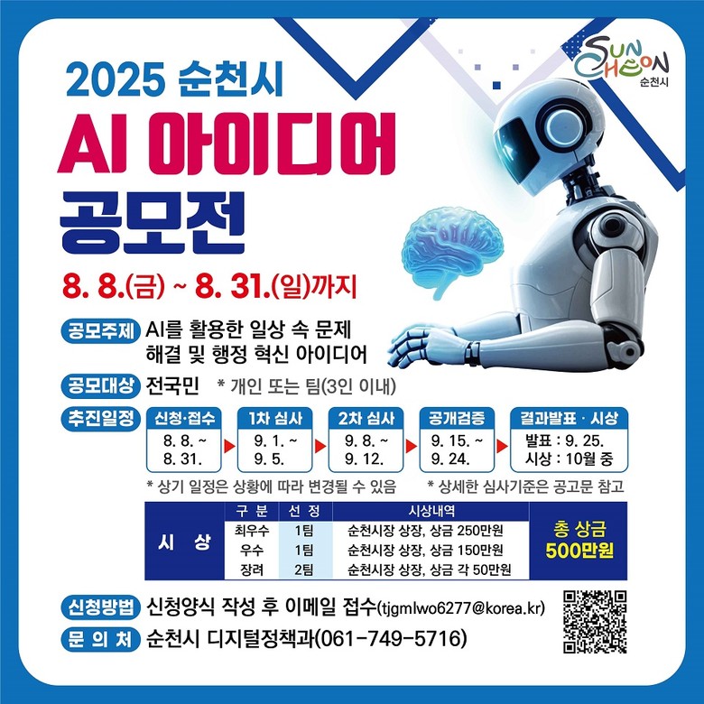 [순천시 세계타임즈=우덕현 기자] 순천시(시장 노관규)는 시민의 삶과 행정서비스를 혁신할 AI 아이디어를 찾기 위해 8일부터 ‘2025 순천시 AI 아이디어 공모전’을 개최한다고 밝혔다.