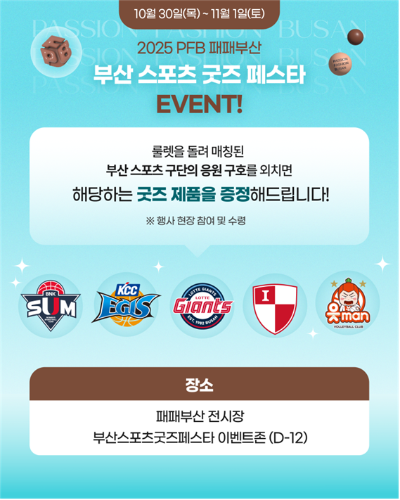 ◈ 프로스포츠는 경제적 파급효과가 큰 산업… 부산 연고 공통분모를 강조하여 지역 스포츠에 대한 관심과 응원 열기 제고 기대 [부산 세계타임즈=이용우 기자] 부산시(시장 박형준)는 오늘(30일)부터 11월 1일까지 벡스코 제1전시장 1홀에서 열리는 '2025 패패부산*'과 연계한 「부산 스포츠 굿즈 페스타」 행사를 개최한다고 밝혔다.
