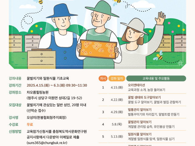청주시 문화유산과 관계자는 청주시 문화유산과 관계자는 “기후위기로 생태 환경이 급변하는 시점에서, 꿀벌의 역할과 그에 담긴 문화유산적 가치에 주목하는 것은 매우 시의적절하다”며 “이번 전승교육을 통해 청주 꿀벌치기가 미래세대에 의미 있게 전해질 수 있기를 바라며, 시민 여러분의 많은 관심과 참여를 부탁드린다”고 전했다. 자세한 교육일정 및 프로그램 내용은 충청북도역사문화연구원 기획연구팀(☎043-279-5461, 5463)으로 문의하면 된다.