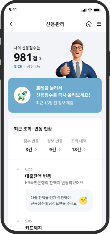 전문 신용평가기관인 NICE평가정보와 제휴한‘신용점수 올리기'는 별도의 자료제출 없이 마이데이터에 금융자산을 연결하는 것만으로 신용점수를 올릴 수 있어 고객에게 금융 혜택을 제공한다.