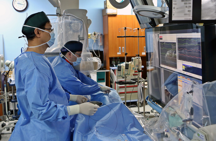 | ▲강동경희대학교병원 심장혈관내과 박창범 교수가 수술을 하고 있다. |