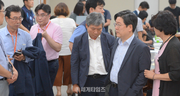 15일 밤 정부세종청사 고용노동부 최저임금위원회 전원회의에서 내년도 최저임금이 7530원으로 확정된 가운데 사용자 위원들이 불만스런 표정을 지으며 회의실을 나서고 있다. 2017.07.15