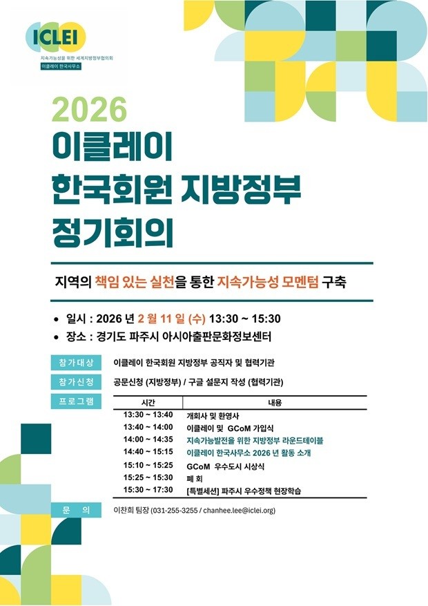 [파주시 세계타임즈=송민수 기자] 파주시는 오는 2월 11일, 파주출판단지 아시아출판문화정보센터에서 「2026 이클레이한국회원 지방정부 정기회의」를 이클레이 한국사무소와 공동 개최한다.