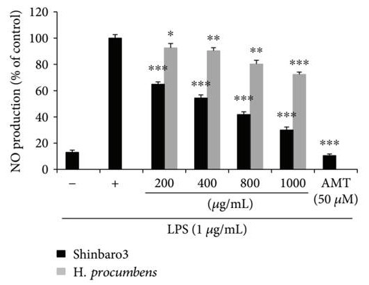 ▲ [표 1] 연구 결과에 따르면 신바로3(Shinbaro3)가 같은 양의 천수근(H.procumbens)보다 활성질소(NO) 억제 효과가 뛰어난 것으로 나타났다. 활성질소 억제 효과가 뛰어나다는 것은 항염증 효과가 크다는 것을 뜻한다 |
