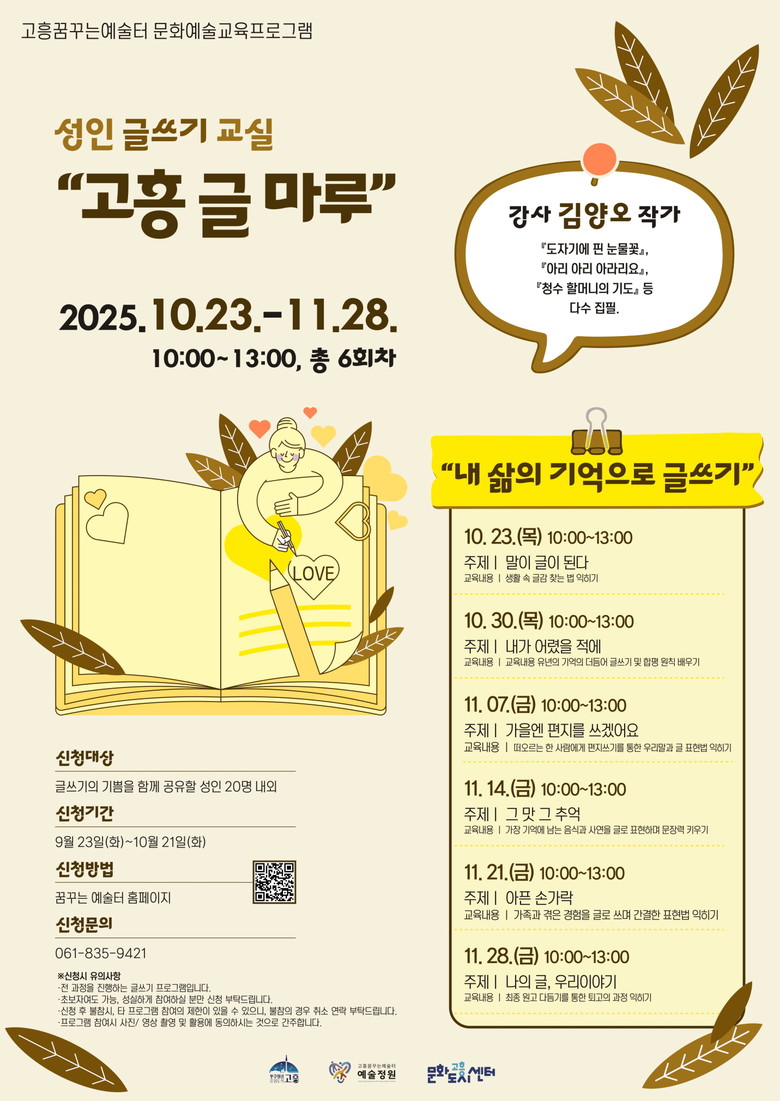 이번 프로그램은 고흥의 중장년층을 대상으로, 평범한 일상 속 경험을 글로 풀어내고 서로의 이야기를 나누는 과정을 통해 자존감과 성취감을 높이는 것을 목표로 한다.