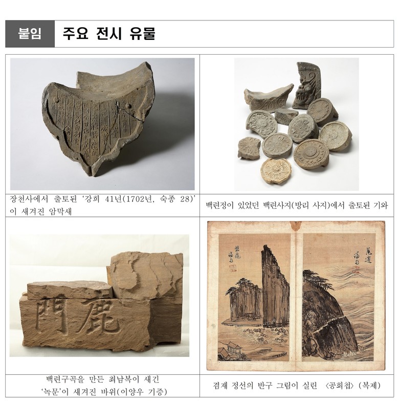 ‘물길 따라 깨달음을 찾다’에서는 반고사·장천사·백련사 등 대곡천 일대 사찰의 역사와 출토 유물을 통해 지역 불교문화의 흐름을 소개한다. 마지막으로 ‘선비들의 이상세계, 반구대와 구곡문화’에서는 고려 말 언양으로 유배 온 정몽주와 반구대 관련 기록을 살펴보며, 수려한 자연 속에서 심신을 수양했던 울산 선비들의 구곡(九曲) 문화를 관련 유물을 통해 선보인다.