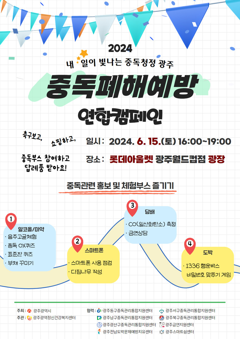 ‘내일이 빛나는 중독 청정 광주’를 주제로 ▲4대 중독(알코올, 도박, 인터넷, 마약) OX 맞추기 ▲음주고글 체험 ▲흡연자 대상 일산화탄소(CO) 측정과 금연상담 ▲행운박스 비밀번호 맞추기(1336) ▲중독예방 부채 꾸미기 등 다양한 체험부스를 운영한다.