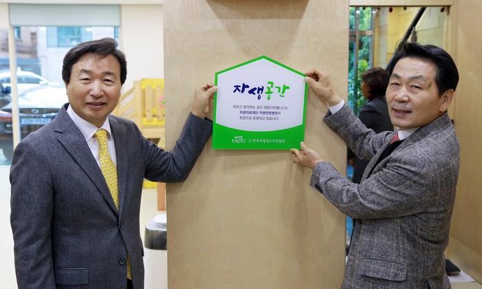 | ▲자생의료재단 신준식 명예이사장(왼쪽), 박병모 이사장(오른쪽)이 한국백혈병소아암협회에 마련된 ‘자라고 생각하는 자생공간’의 현판을 달고 있다. |