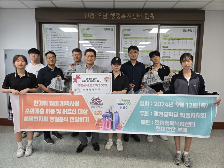 [남양주시 세계타임즈=송민수 기자] 경기도구리남양주교육지원청 광릉중학교(교장 민연식)는 민속 명절 한가위를 맞이하여 지역사회 소외계층 아동과 어르신들에게 희망 편지와 명절 음식을 정성껏 만들어 전달했다.