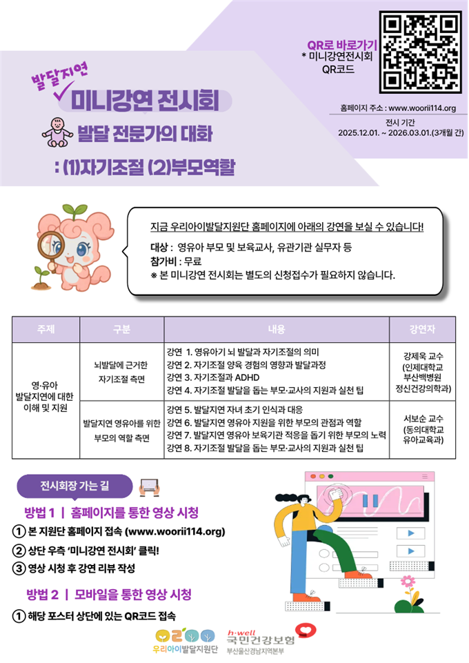 이번 미니강연 전시회는 온라인 영상 강연 형식으로 열리며, 영상은 1편(자기조절)과 2편(부모역할)으로 나눠서 게시된다.