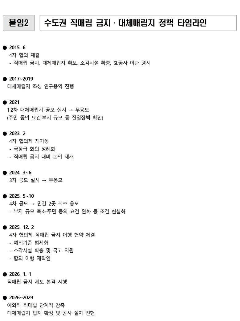 수도권매립지 갈등은 지난 10여 년간 반복된 논의 속에서 중심축이 형성되어 왔다. 2015년 4자 협의체(기후부·서울시·인천시·경기도)는 수도권매립지 사용 최소화와 대체매립지 확보를 골자로 하는 최종 합의서에 서명했다.