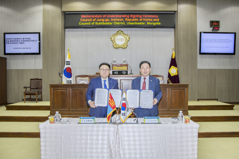 [중구 세계타임즈=심하린 기자] 인천광역시 중구의회(의장 강후공)가 지난 13일 몽골 울란바타르시 수흐바타르구의회(의장 부흐촐롱 엥흐볼드)와 상호 협력 증진 및 공동 발전을 위한 우호 협력 양해각서(MOU)를 체결하였다.