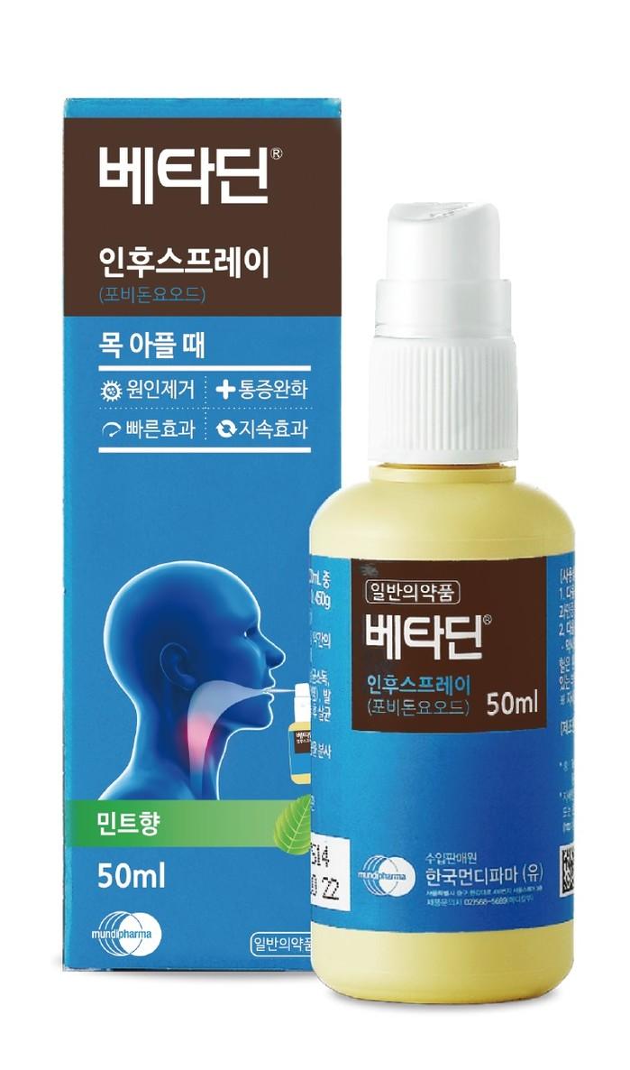 현재 시판중인 포비돈요오드가 함유된 구강제품으로는 한국먼디파마의 베타딘® 인후스프레이가 있다. 해당 제품은 0.45% 포비돈요오드를 함유하고 있어 목이 아플 때 뿌리면 통증 등의 증상 완화 효과가 있을 뿐 아니라 원인까지 직접 제거하는 인후염 치료제이다. 감기나 인후두염 등 호흡기 질환을 유발하는 바이러스 제거에 효과적인 제품이다. 휴대가 용이한 스프레이 타입으로 입안에 간편하게 분사해 사용할 수 있으며, 보호자의 지도 아래 6세 이상 소아도 사용 가능하다.