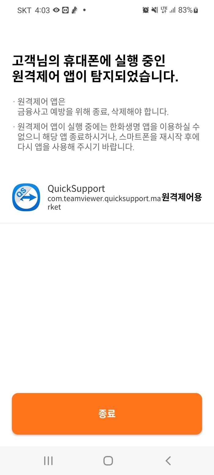 ‘한화생명APP’ 실행시 휴대폰 내 악성 어플 실시간 탐지 후 삭제 안내