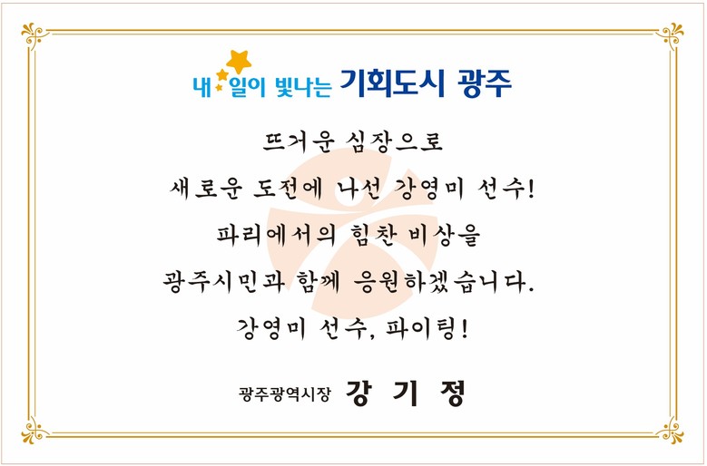 강 시장은 제33회 파리올림픽 대회 개막을 사흘 앞둔 23일 막바지 훈련과 컨디션 조절에 나선 전웅태 등 광주시 소속 선수단에게 “뜨거운 심장으로 새로운 도전에 나섰다”며 “파리에서의 힘찬 비상을 광주시민과 함께 응원하겠다”고 격려했다.