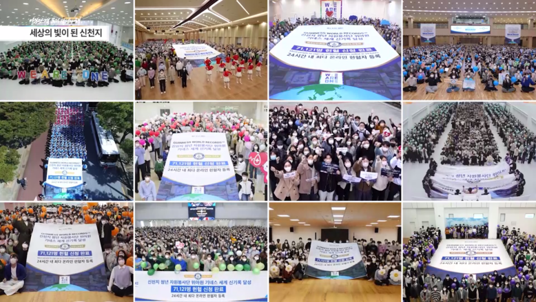 또한 신천지예수교회는 지난해 2차에 걸친 대대적인 헌혈 캠페인을 진행하며 사회 공헌 활동에도 힘을 쏟았다. 그 결과 1차 1만 8천819명, 2차 7만 3천807명이 헌혈에 동참하며 단일기관 최단기간 최다인원 헌혈을 달성하고 최다 헌혈증 기부로 한국기록원(KRI)의 인증과 기네스 세계기록을 세웠다. 그리고 지난해 7월에는 국내외 청년 9만여 명으로 구성된 자원봉사단 ‘위아원’이 출범하며, 청년들을 주축으로 범국가적 난제와 지구촌 위기 해결에 나서겠다는 계획을 밝히기도 했다.