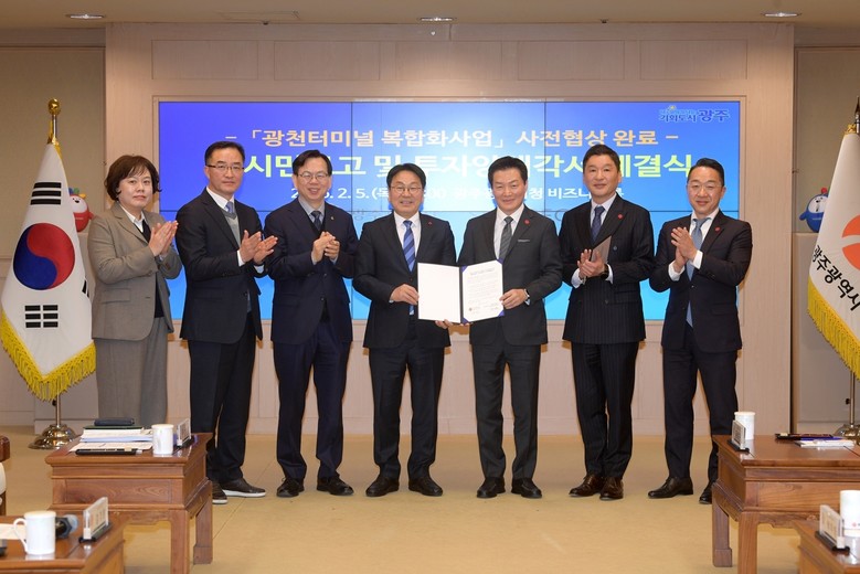 광주광역시(시장 강기정)는 ㈜신세계와 5일 시청 비즈니스룸에서 ‘광천터미널 복합화사업 도시계획변경 사전협상 결과 대시민 보고회 및 투자 양해각서 체결식’을 개최했다.
