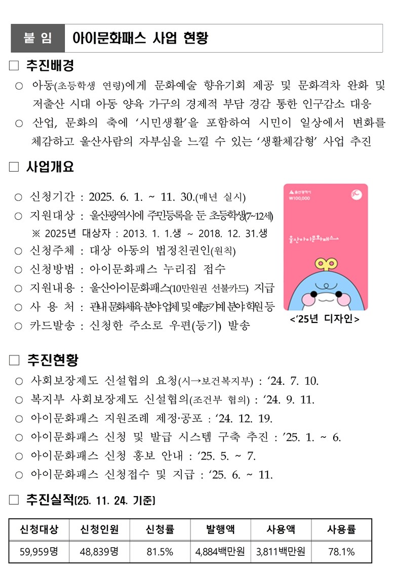 울산시 관계자는 “울산아이문화패스가 아이들의 문화향유 기회 확대와 지역 경제 활성화에 직접적인 도움을 주고 있다”라며, “남은 기간 동안 지원대상 아동들이 빠짐없이 혜택을 누릴 수 있도록 적극적 신청과 사용을 당부드린다”라고 말했다.