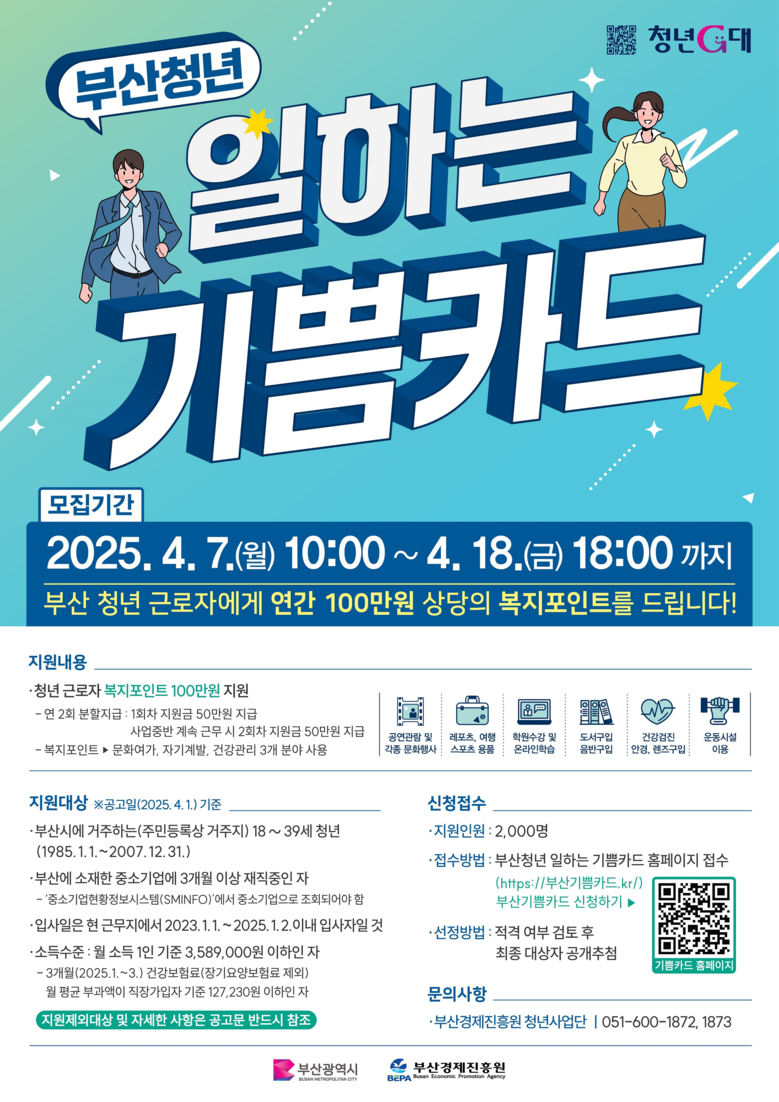 주민등록상 부산에 거주하며, 부산에 있는 중소기업에 3개월 이상 재직 중인 18~39세 청년에게 1인당 1백만 원의 복지포인트를 지원하며, 지난해 1천650명에서 올해는 지원 인원을 확대해 2천 명의 참여자를 모집한다.