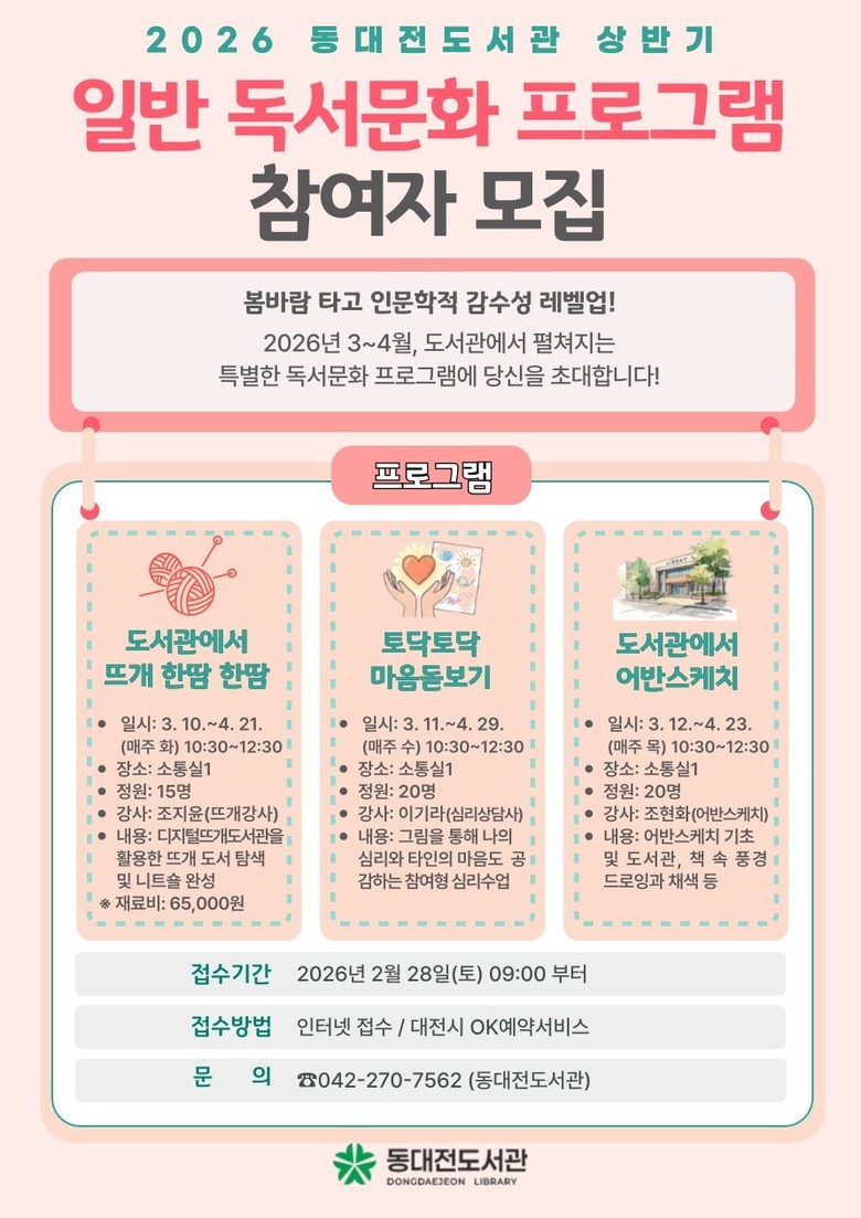 자세한 내용은 동대전도서관 정보서비스팀(☎042-270-7562)으로 문의하면 된다.
