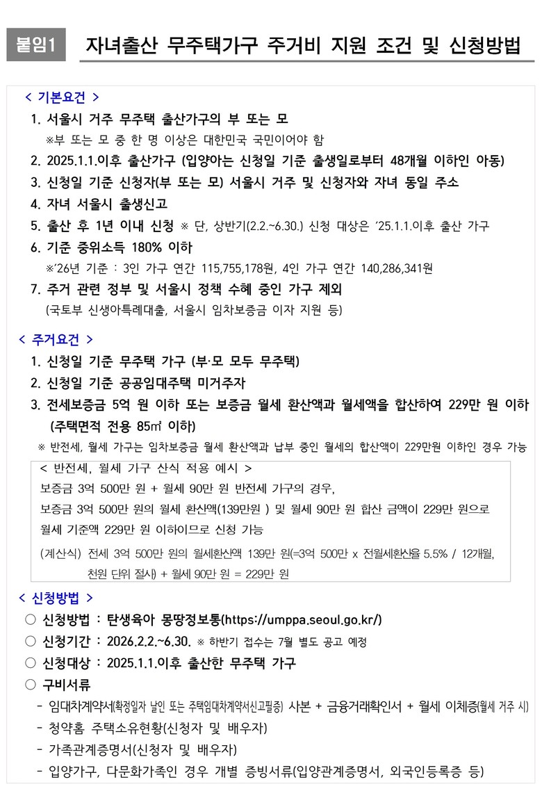 신청 자격은 자녀를 출산한 무주택가구 중 ▴기준 중위소득 180% 이하 ▴서울에 소재한 전세가 5억 원 이하 또는 월세(환산액) 229만 원 이하* 임차 주택에 거주 등이며, 공공임대주택 입주자 및 서울시 임차보증금 이자 지원 등 정부·서울시 주거 지원 정책을 수혜 중인 가구는 제외된다. 기타 상세 자격요건은 2.2.(월)부터 서울시 및 ‘탄생육아 몽땅정보통’ 누리집(umppa.seoul.go.kr)의 공고문을 통해 확인 가능하다.