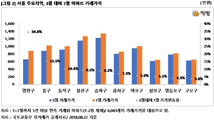 다음은 동작구가 10.4% 상승했다. 동작구는 투기지역에 속하지 않아 상대적으로 규제를 덜 받는 지역으로 매수자들의 선호도가 높아졌다. 뒤를 이어 용산구가 9.5% 거래가격이 상승했다. 용산은 7월 여의도와 융합 통합개발계획이 발표되면서 개발 기대감이 높아졌다.
