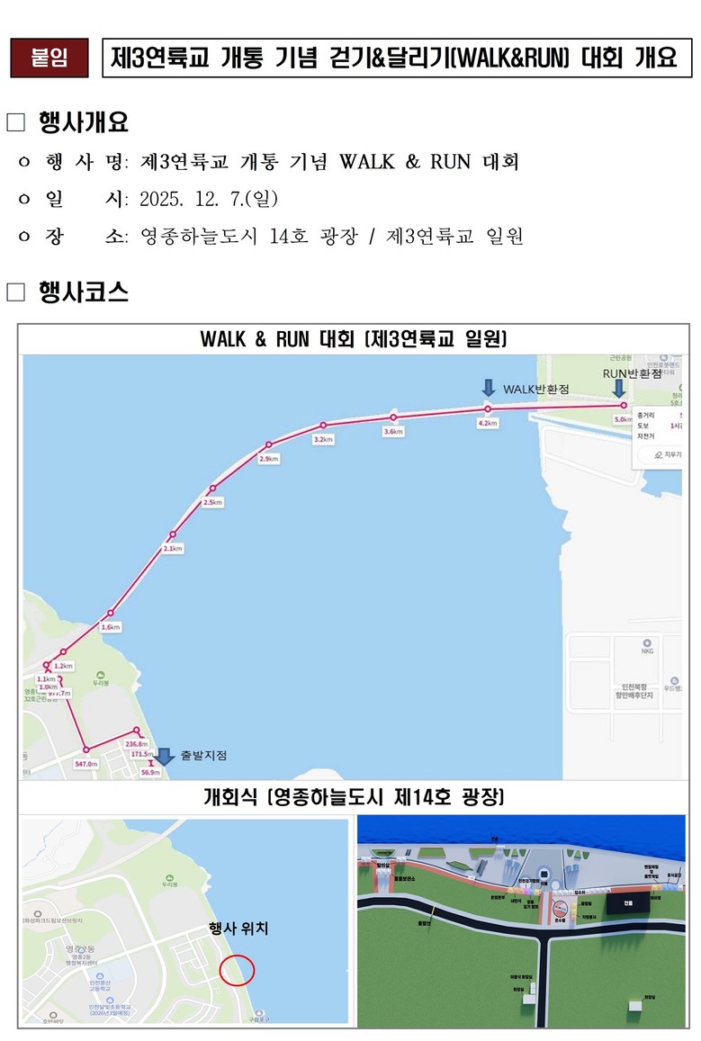 이번 행사에는 걷기(WALK) 약 2,000명, 달리기(RUN) 약 2,000명 등 총 4,000여 명의 시민이 참여해 제3연륙교 상부를 함께 걸으며 축제 분위기를 만들었다. 이날 행사에는 유정복 인천시장도 참석해 시민들과 발걸음을 함께했다.