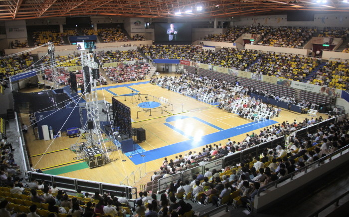 충청 인근 지역들의 여호와의 증인들이 천안 유관순 체육관에서 '사랑은 없어지지 않습니다'라는 주제로 열리는 천안지역대회에서 전경.