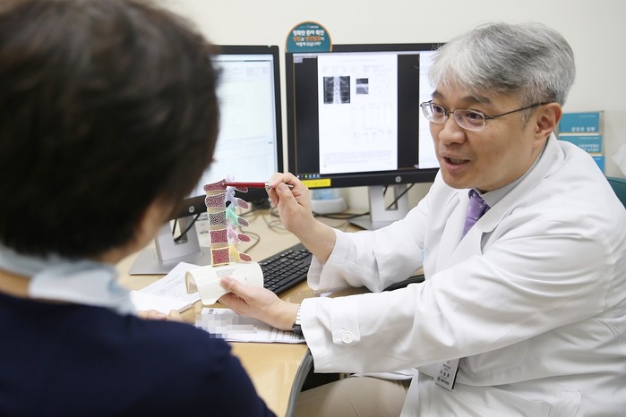 | ▲이승훈 교수가 폐경기 골다공증 환자를 진료 상담하고 있다. |