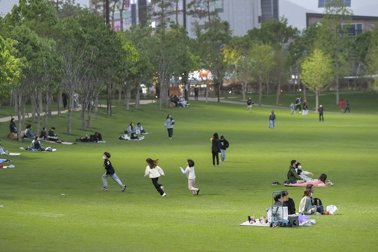 이들은 돗자리를 깔고 맥주를 마시며 자연을 즐기는가 하면, 반려동물과 산책도 하고 어린이들은 푸른 잔디를 맘껏 뛰어 다니고 있다.