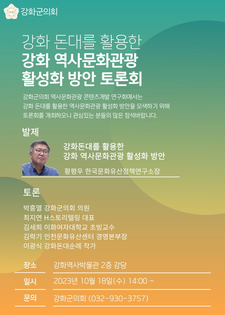 강화 돈대를 활용한 강화의 역사문화관광 연구 결과 및 활성화 방안을 논의하기 위해 기획됐으며, 각 분야의 전문가를 초청해 함께 논의하는 장이 될 예정이다.
