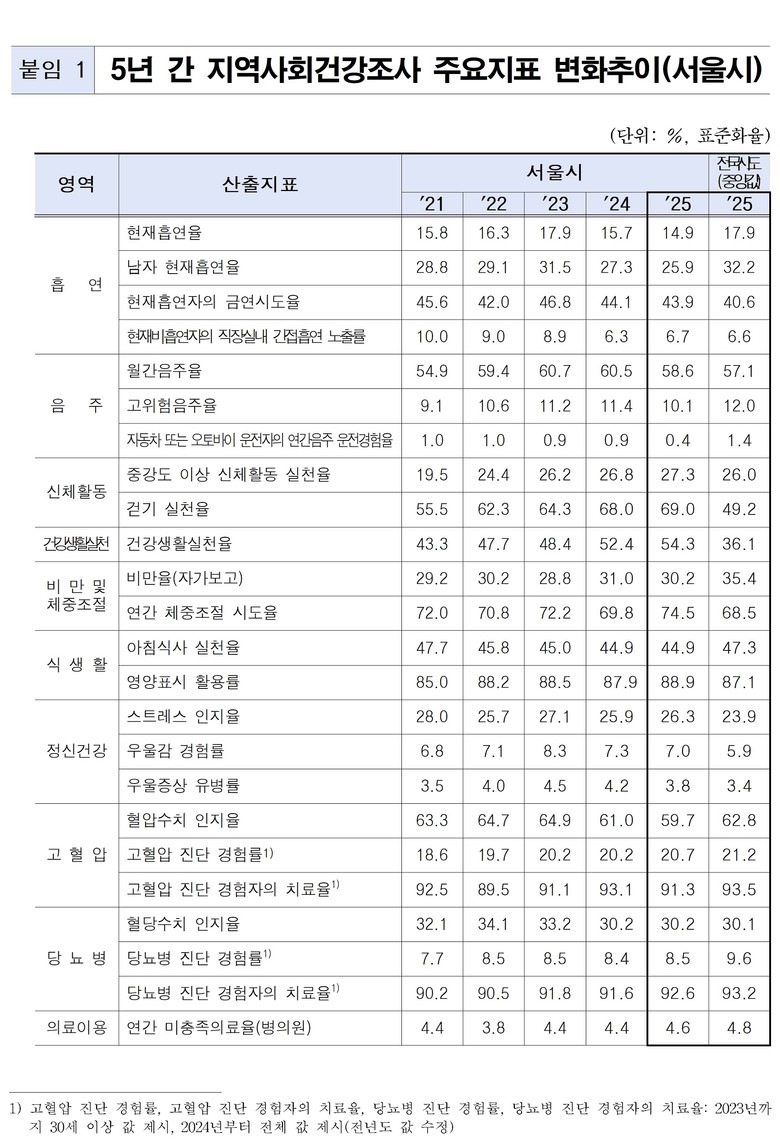<질병청 ’25년 지역사회건강조사 결과, 서울시민 걷기‧건강생활실천율 전국 1위>