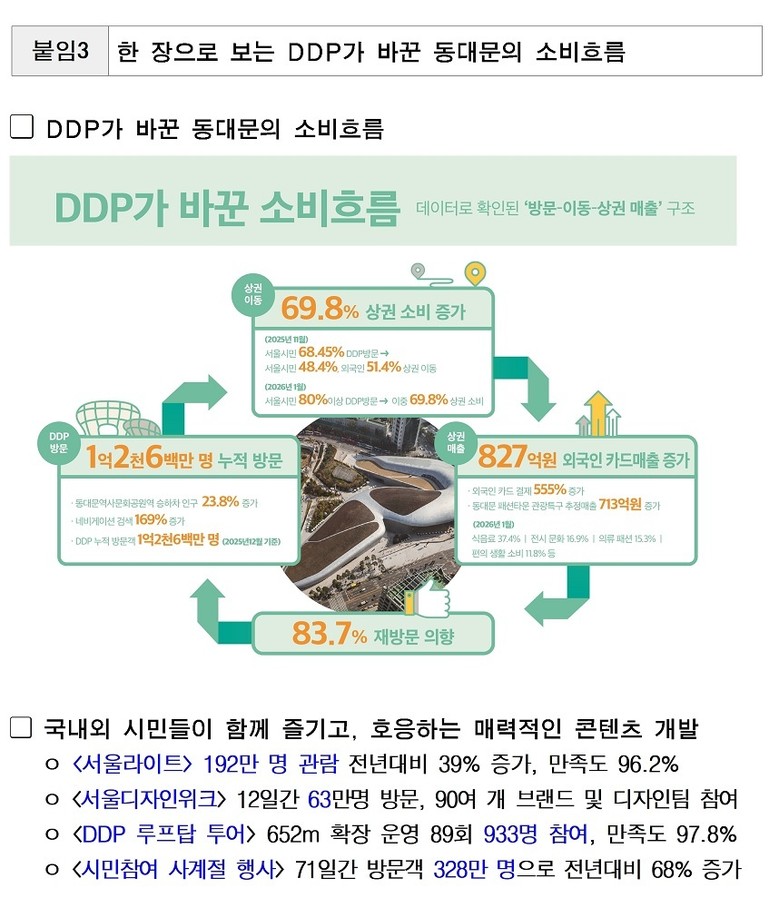 실제로 DDP가 위치한 동대문역사문화공원역(2‧5호선) 승하차 인원이 몇 년새 뚜렷하게 증가했으며, 네비게이션 목적지 검색건수도 늘었다. 또한 DDP 방문객 10명 중 7명(69.8%)은 주변 상권을 이용했다고 답해 DDP가 지역 상권 소비 매개로 자리잡았다는 것이 데이터로 확인되고 있다. 특히 외국인들이 만족하는 서울 대표 명소로 꼽히며 외국인의 인근 상권 지출이 2년새 6.5배나 증가했다.