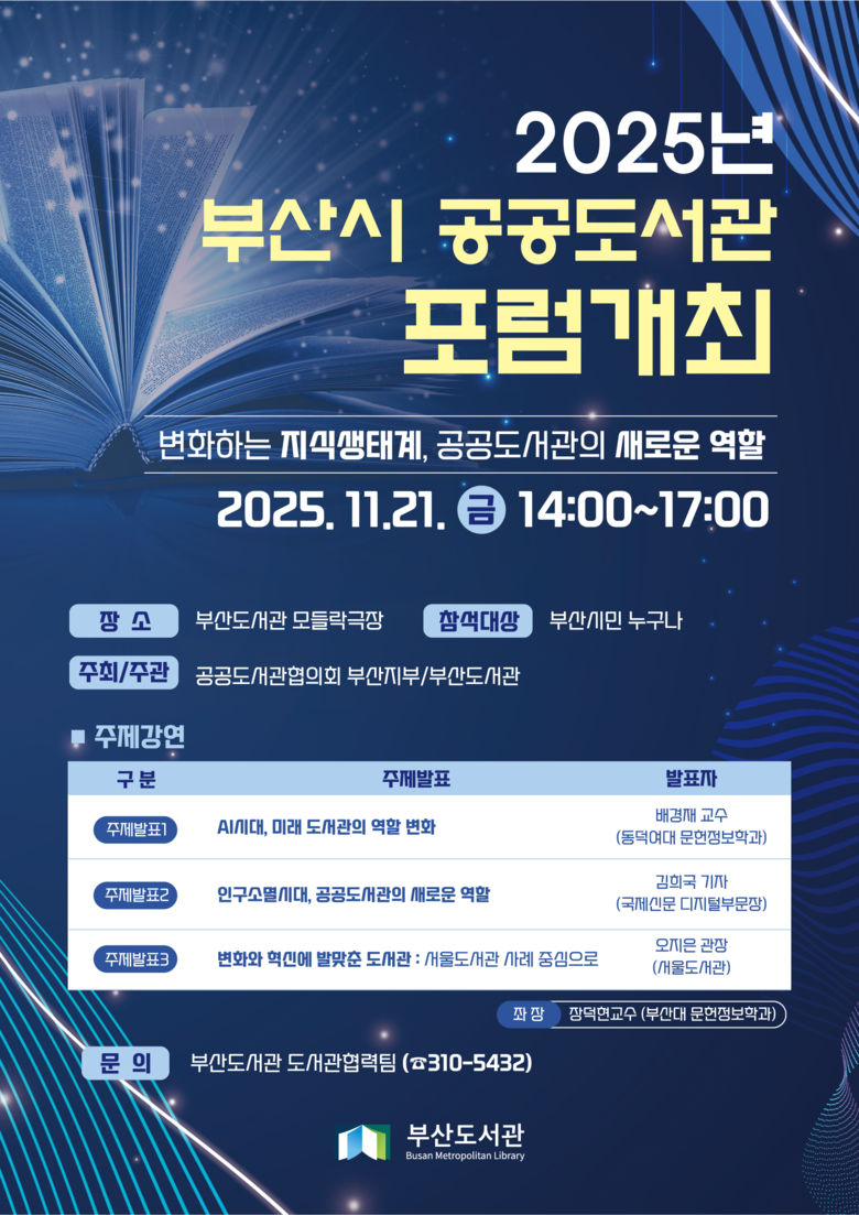 ◈ '변화하는 지식생태계, 공공도서관의 새로운 역할'을 주제로 ▲동덕여대 배경재 교수가 '인공 지능(AI)시대 미래도서관' ▲국제신문 김희국 기자가 '인구소멸시대, 공공도서관의 새로운 역할' ▲서울도서관 오지은 관장이 '변화와 혁신에 발맞춘 도서관'을 발표해 [부산 세계타임즈=이용우 기자] 부산도서관은 개관 5주년을 맞아 오는 11월 21일 오후 2시 도서관 지하 1층 모들락극장에서 「2025 부산시 공공도서관 포럼」을 개최한다고 밝혔다.