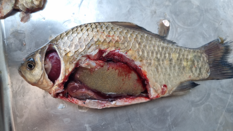 | ▲ 공지천에서 채집한 산란기 붕어(체내에 알을 형성하고 있는 모습) |